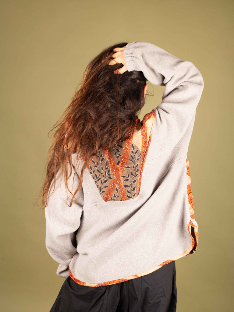 Un polar muy calentito de color gris está elaborada con tejidos de saree bordados muy especiales, que hacen de cada prenda una pieza única y artesanal. Tiene cuello alto y capucha, perfecta para los días de viento, con dos bolsillos laterales.