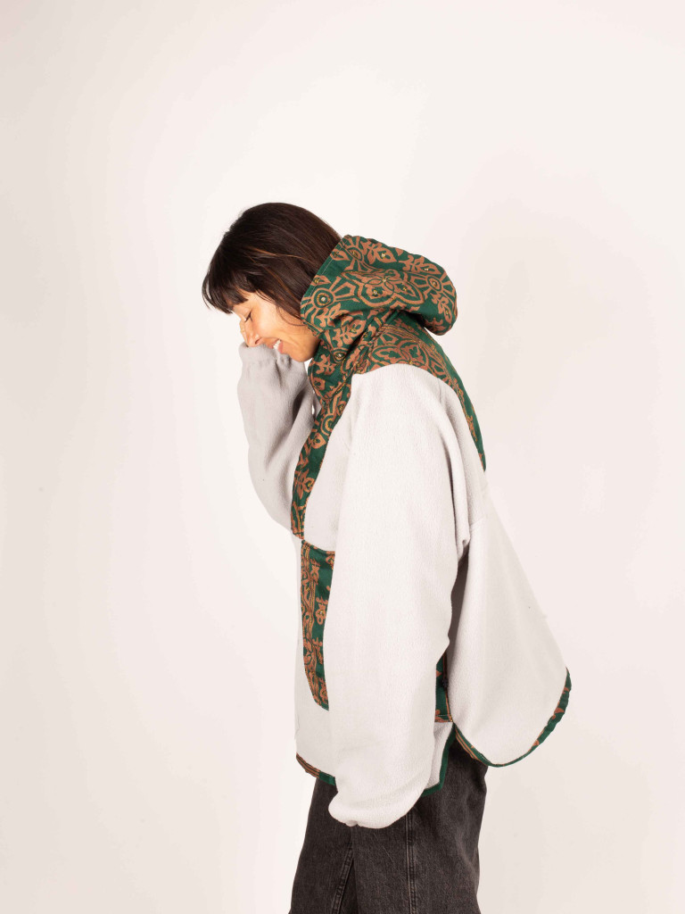 Un polar muy calentito de color gris está elaborada con tejidos de saree bordados muy especiales, que hacen de cada prenda una pieza única y artesanal. Tiene cuello alto y capucha, perfecta para los días de viento, con dos bolsillos laterales.