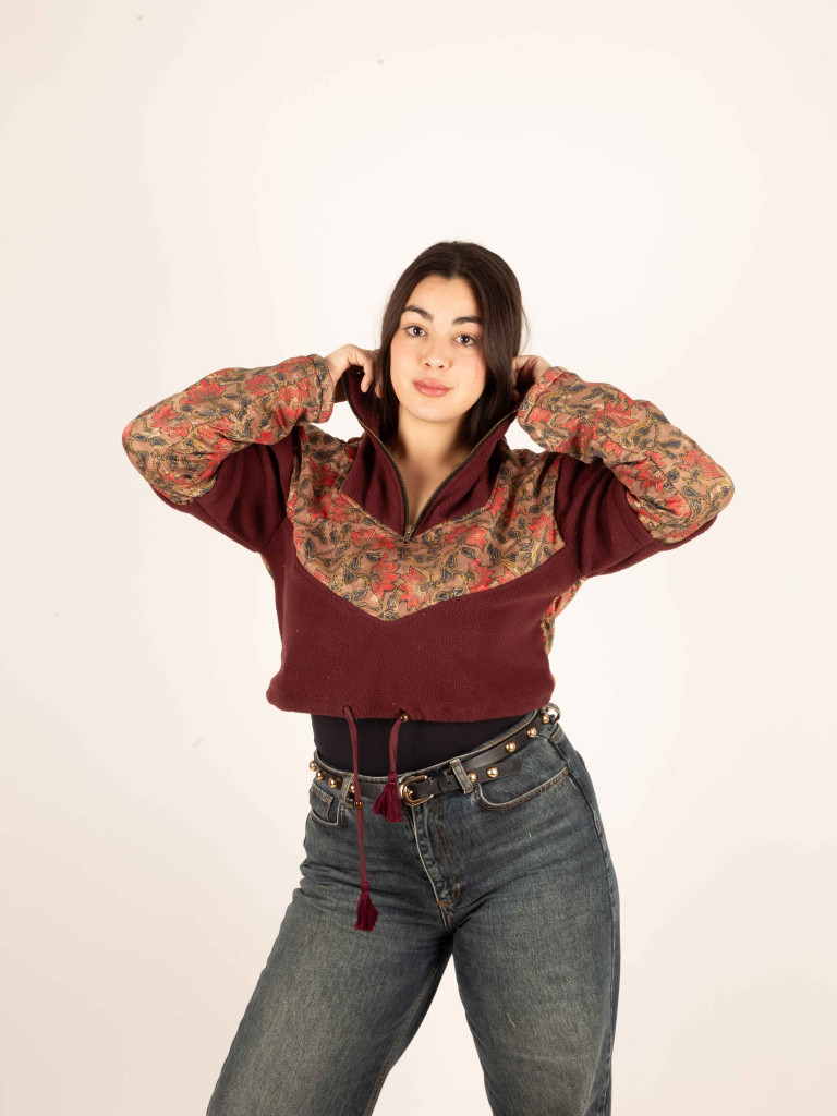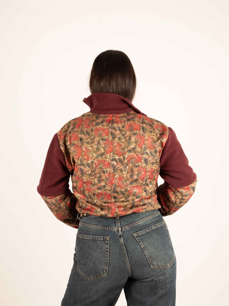 Un polar súper calentito de color granate y decorado con telas tradicionales indias de sarees reciclados. Tiene cuello alto, perfecta para los días de viento y se puede abrir con cremallera.