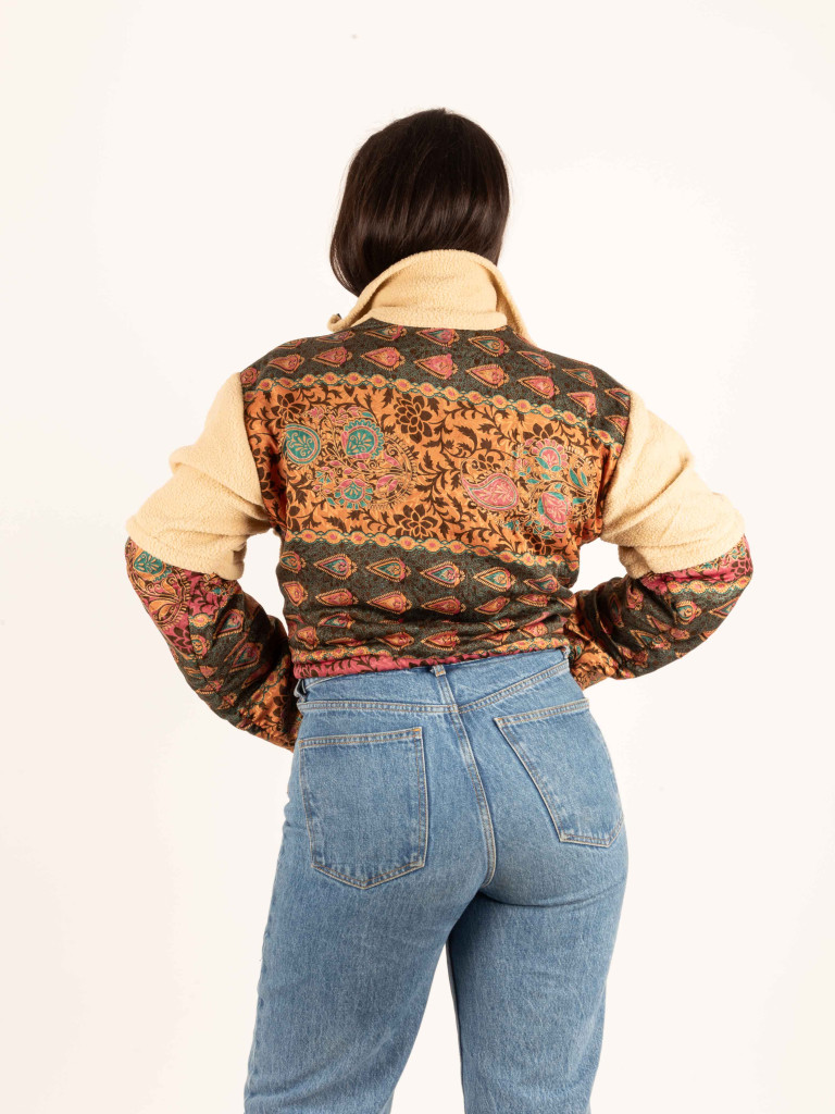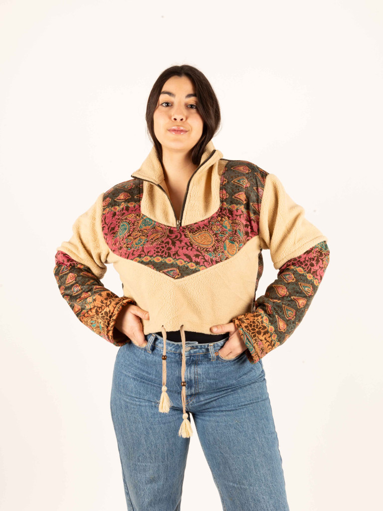 Un polar súper calentito de color crema y decorado con telas tradicionales indias de sarees reciclados. Tiene cuello alto, perfecta para los días de viento y se puede abrir con cremallera.