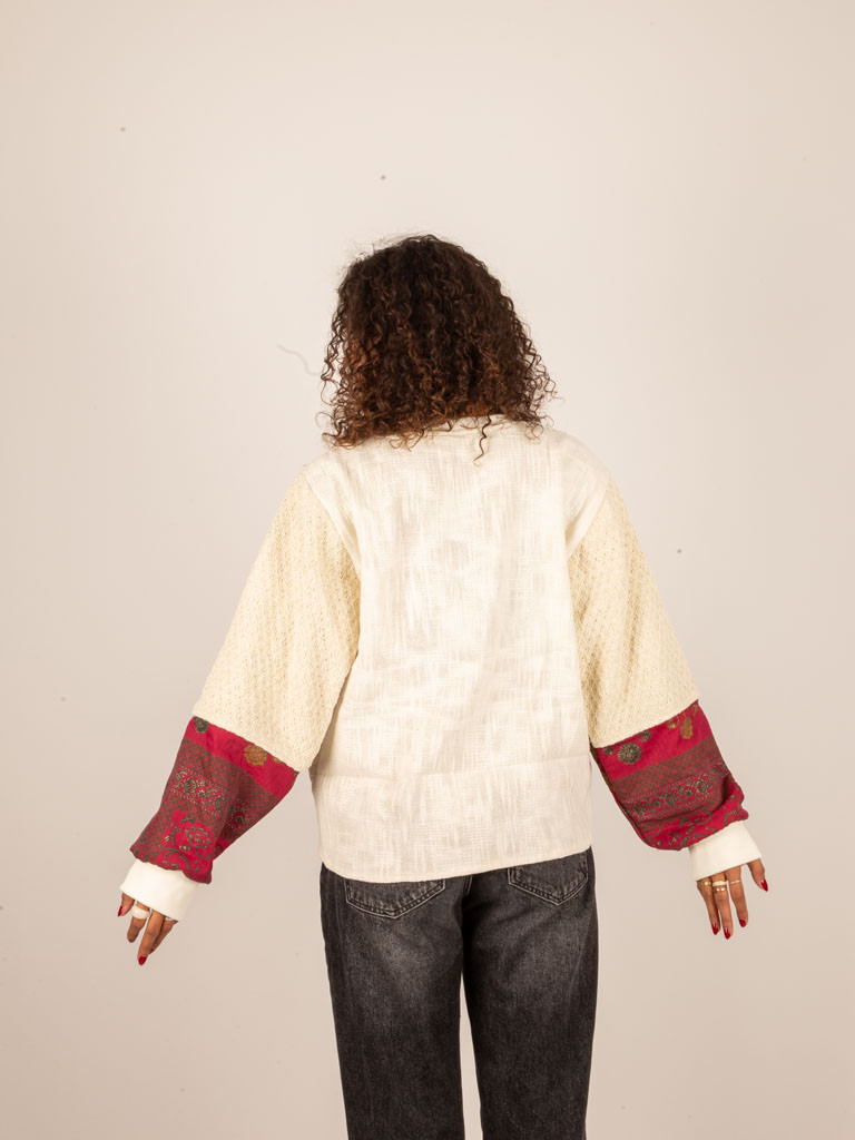 Opening Heart es una prenda confeccionada a mano en un suave tejido calado de algodón en color blanco roto con un diseño asimétrico en la parte central y un toque de color en las mangas con nuestros maravillosos sarees a los que les damos una segunda vida.