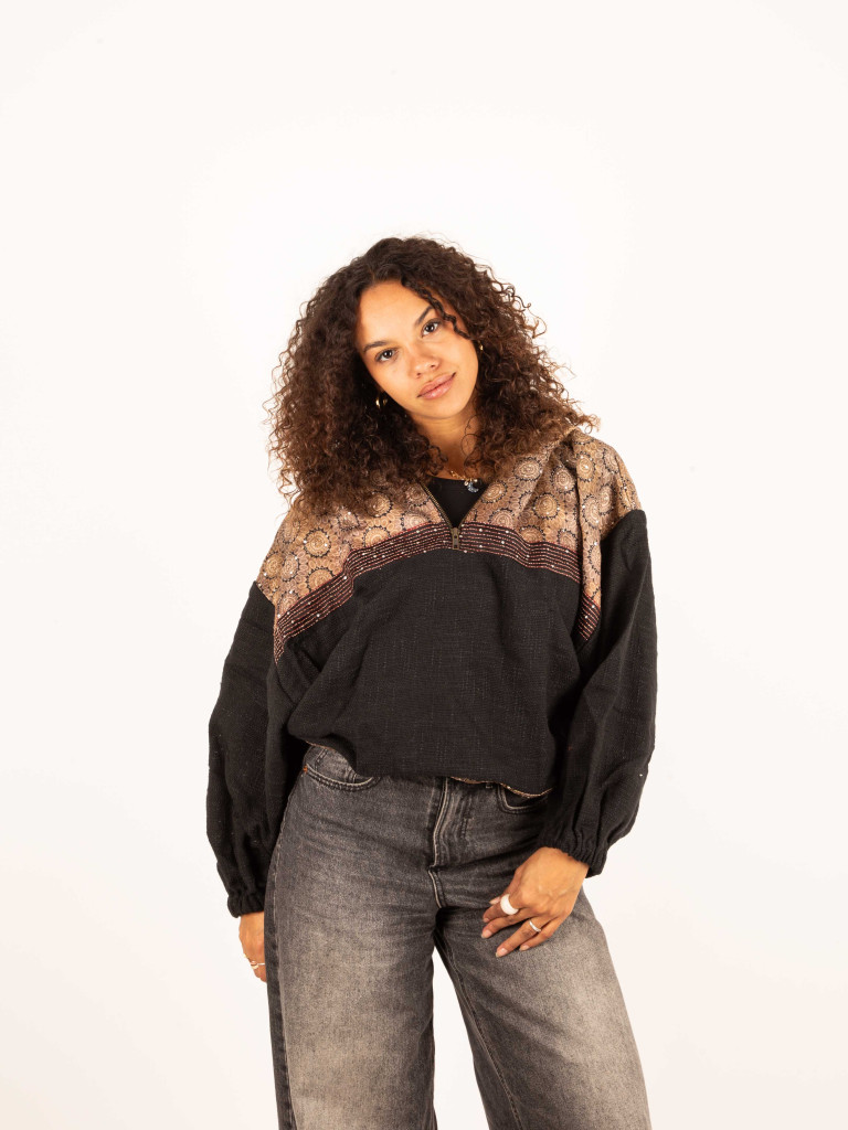 Confeccionada a mano en un suave tejido de algodón 100%  de color negro y decorado en este caso con tejidos de saree bordados muy especiales