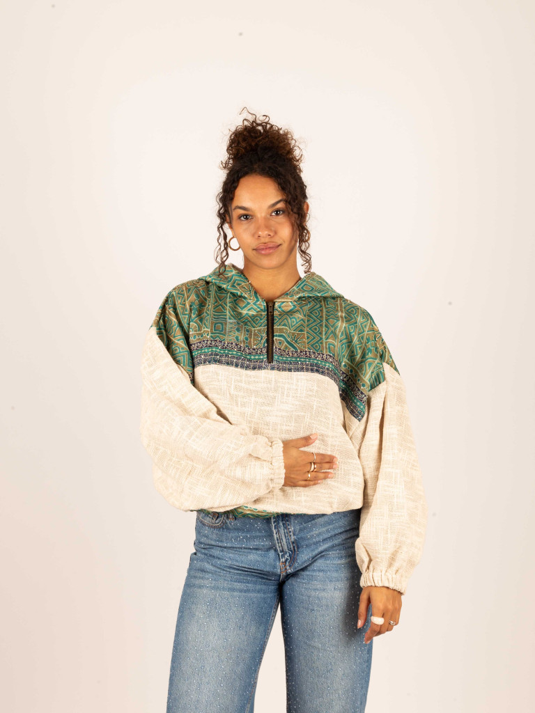 Confeccionada a mano en un suave tejido de algodón 100%  de color blanco y decorado en este caso con tejidos de saree bordados muy especiales