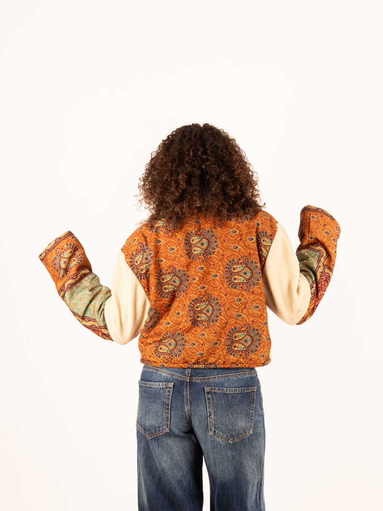 Un polar súper calentito de color crema y decorado con telas tradicionales indias de sarees reciclados. Tiene cuello alto, perfecta para los días de viento y se puede abrir con cremallera.