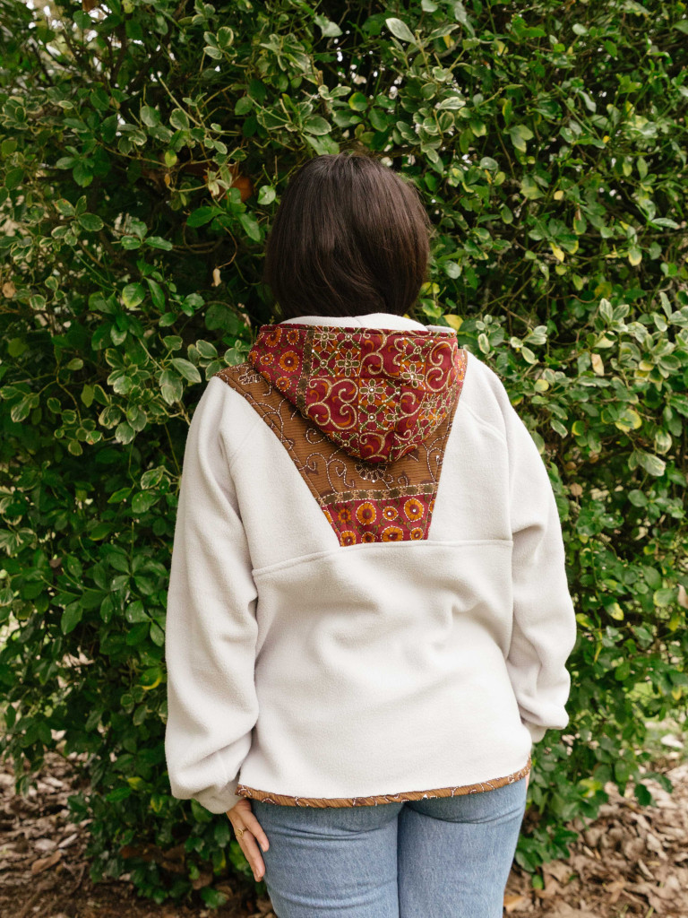 Un polar muy calentito de color gris está elaborada con tejidos de saree bordados muy especiales, que hacen de cada prenda una pieza única y artesanal. Tiene cuello alto y capucha, perfecta para los días de viento, con dos bolsillos laterales.