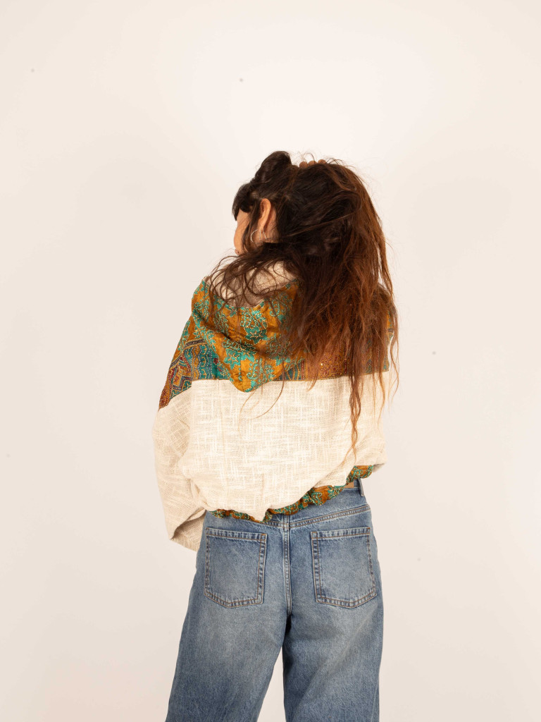 Confeccionada a mano en un suave tejido de algodón 100%  de color blanco y decorado en este caso con tejidos de saree bordados muy especiales