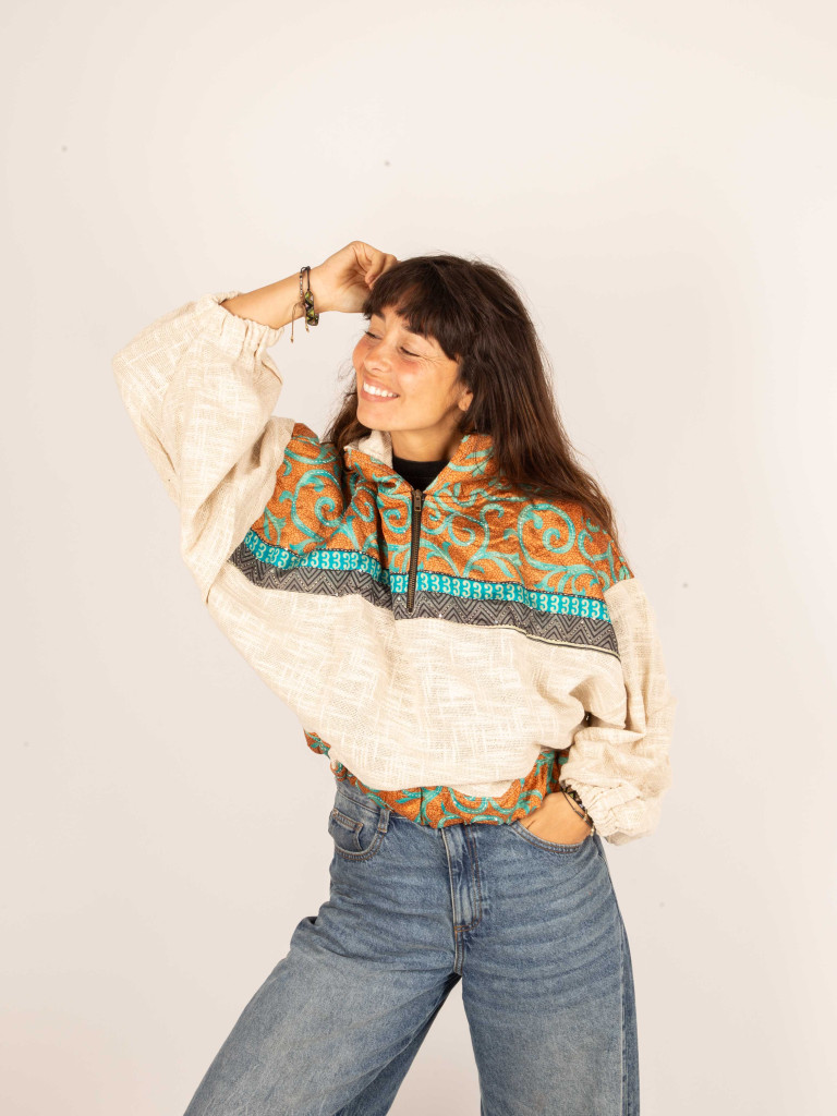 Confeccionada a mano en un suave tejido de algodón 100%  de color blanco y decorado en este caso con tejidos de saree bordados muy especiales