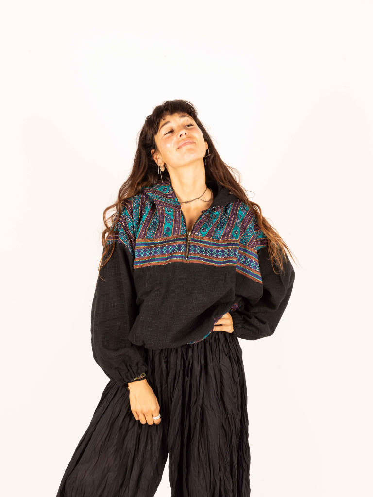 Confeccionada a mano en un suave tejido de algodón 100%  de color negro y decorado en este caso con tejidos de saree bordados muy especiales
