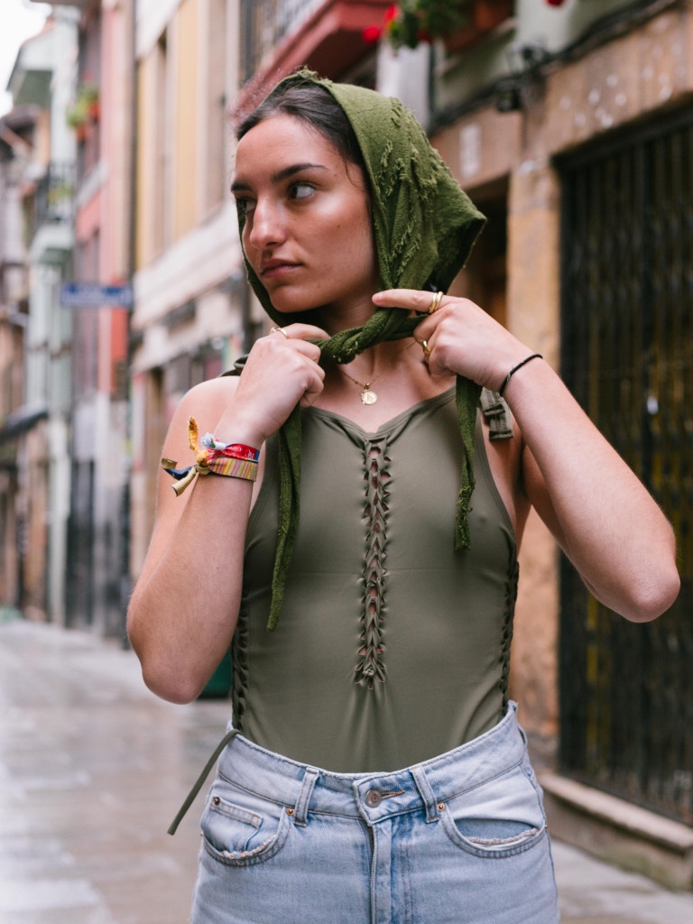 Está elaborado a mano con un tejido verde botella de algodón y lycra para que aporte la elasticidad perfecta y se adapte perfectamente a tu cuerpo.