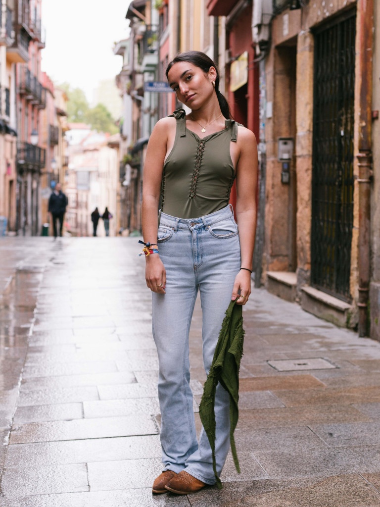 Se ata en los hombros con dos lazadas, es de color verde botella. Un color que combina con todo.