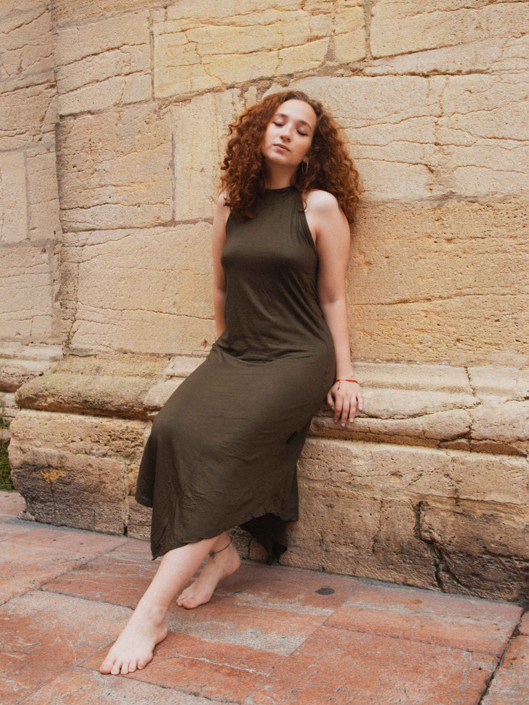 Vestido verde caqui con corte asimétrico en la parte baja y tirantes que se atan en el cuello dejando la espalda al descubierto.