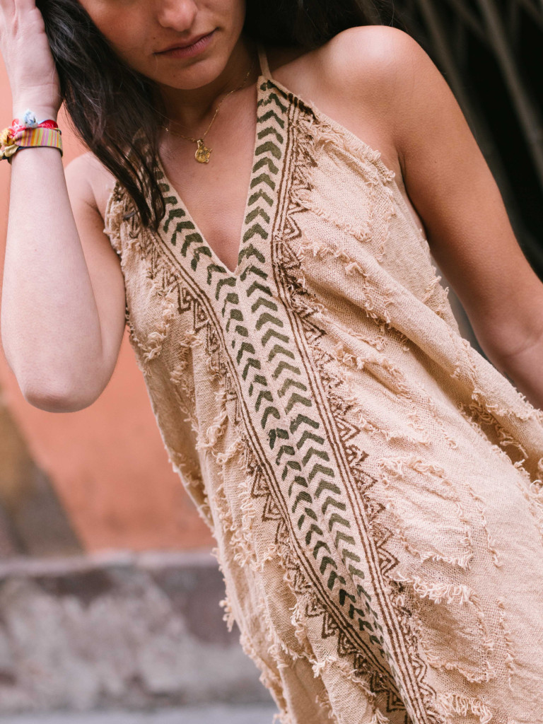 Tiene un diseño muy original con tejido deshilachado, es corto, con estampado Handblock en la parte frontal y un precioso escote en la espalda.