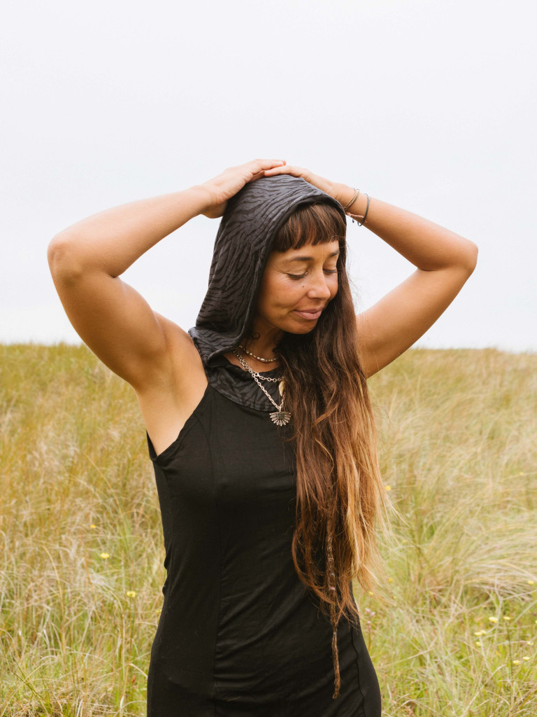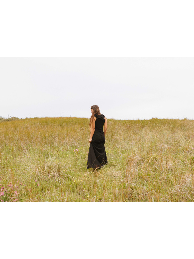 Con capucha, abertura lateral en las piernas y es de tirantes.